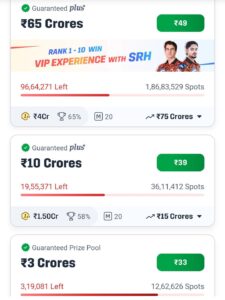 These contests have an entry fee usually starting from as low as Rs. 33. You can play with multiple teams to increase your chances of winning, as high as 20 teams, depending on the fantasy app. The winning prize is a big amount but the probability to win the grand prize is very low due to a large number of teams in a contest.