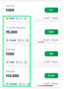 Notice the winning prize and entry fee. You will still need to create a risky team but your chances of winning are slightly higher here.